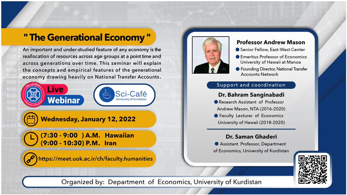 پروفسور اندرو میسون در این وبینار، مفاهیم و ویژگی¬‌های تجربی اقتصاد نسلی را با استفاده از حساب‌های انتقال ملی  (NTA) توضیح دادند. گذار جمعیتی، چرخه حیات، کسری‌ها و تامین مالی آنها، تخصیص مجدد و چالش‌های سیاستی در جوامع از محورهای بحث بودند.
