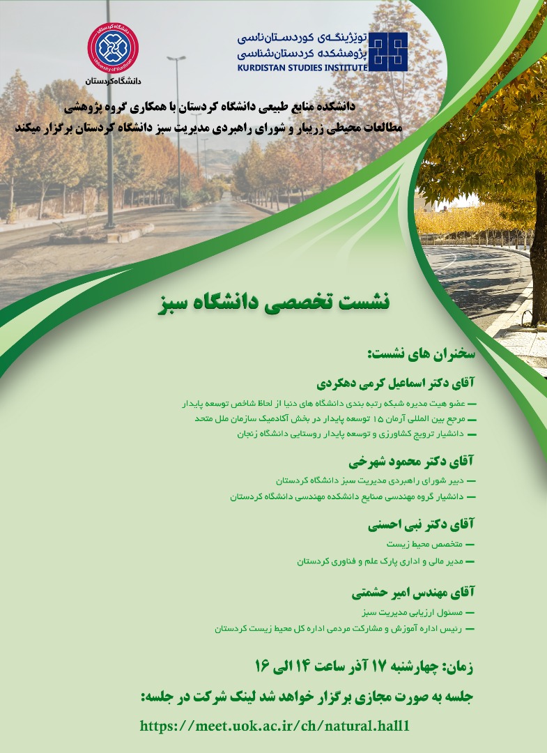 دانشکده منابع طبیعی دانشگاه کردستان با همکاری گروه پژوهشی مطالعات محیطی زریبار و شورای راهبردی مدیریت سبز دانشگاه کردستان برگزار می کند.