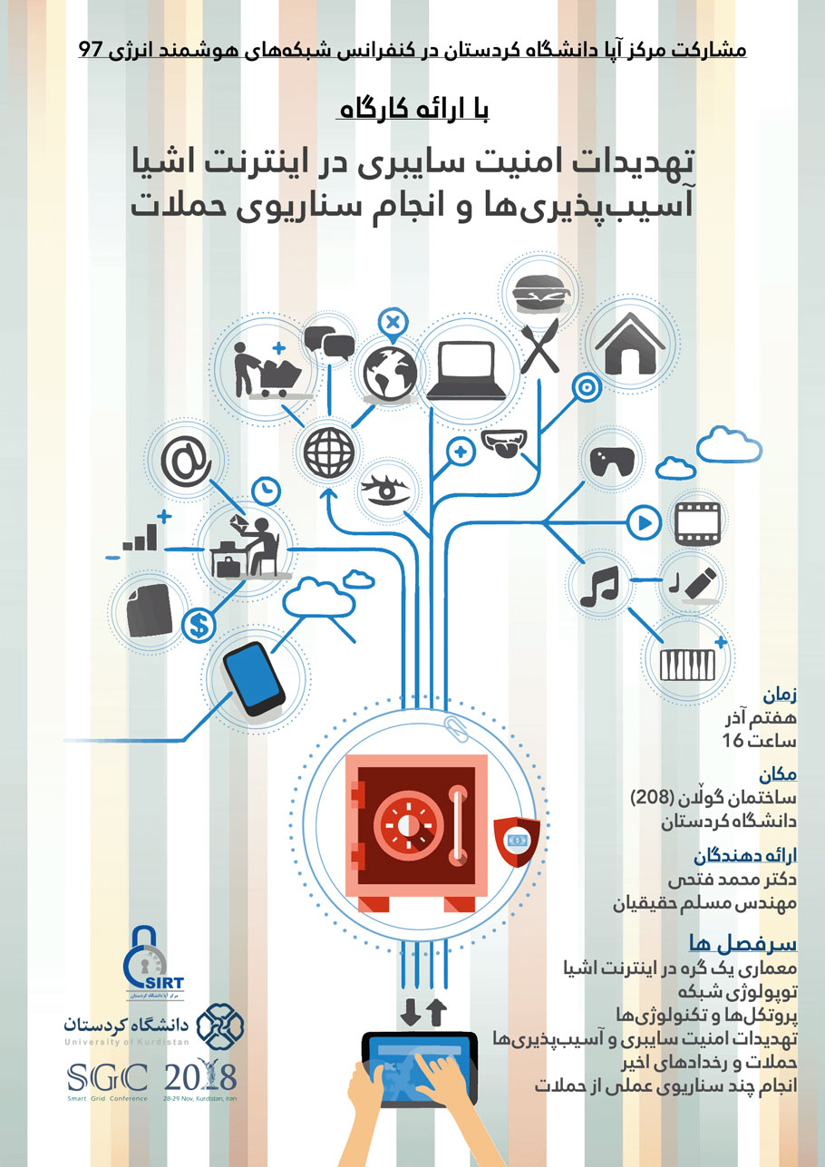 اینترنت اشیاء شبکه‌اي از دستگاه‌ها از قبیل سنسورها و محرک‌ها در یک محیط فیزیکی است. این دستگاه‌ها از طریق یک تکنولوژي سیمی یا رادیویی به شبکه سراسري اینترنت متصل شده و براي اهداف کنترل و مانیتورینگ استفاده می‌شوند. اینترنت اشیاء دارای کاربردهای فراوانی در حمل و نقل، کنترل ترافیک، محیط‌های هوشمند، و سلامت عمومی می‌باشد. به طور ویژه، اینترنت اشیاء می‌تواند توسط شبکه‌های هوشمند الکتریکی براي اهداف کنترل، مانیتورینگ و زیرساخت اندازه‌گیريی هوشمند استفاده شود. مشابه همه تکنولوژی‌های ارتباطی و اطلاعاتی، اینترنت اشیاء نیز با چالش‌هایی از قبیل قابلیت ارتباط دستگاه‌ها باهم، مدیریت، نگهداری، سیگنالینگ، پهنای باند و مصرف توان مواجه است. یکی از مهمترین این چالش‌ها، تهدیدات سایبري و حریم خصوصی است. یک دستگاه متصل به شبکه سراسری در معرض آسیب‌پذیری و بهره‌برداری توسط کاربران مخرب است. به صورت ویژه، به دلیل محدودیت در منابع انرژی و پردازشی دستگاه‌ها، اینترنت اشیاء بطور قابل توجهی در معرض اختلال و قطع عملکرد می‌باشد. در این کارگاه، مقدمات و مفاهیم پایه اینترنت اشیاء شامل تکنولوژی‌ها، پروتکل‌ها، کاربردها، و تهدیدات امنیت سایبری ارائه خواهد شد. سپس در ادامه، با بهره‌برداری از آسیب‌پذیری‌های موجود، چند سناریوی حمله سایبری انجام می‌شود.