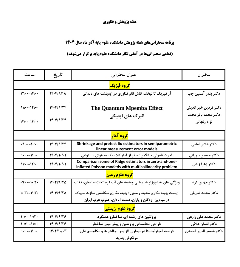 برنامه سخنرانیهای هفته پژوهش دانشکده علوم پایه آذر ماه سال 1404
