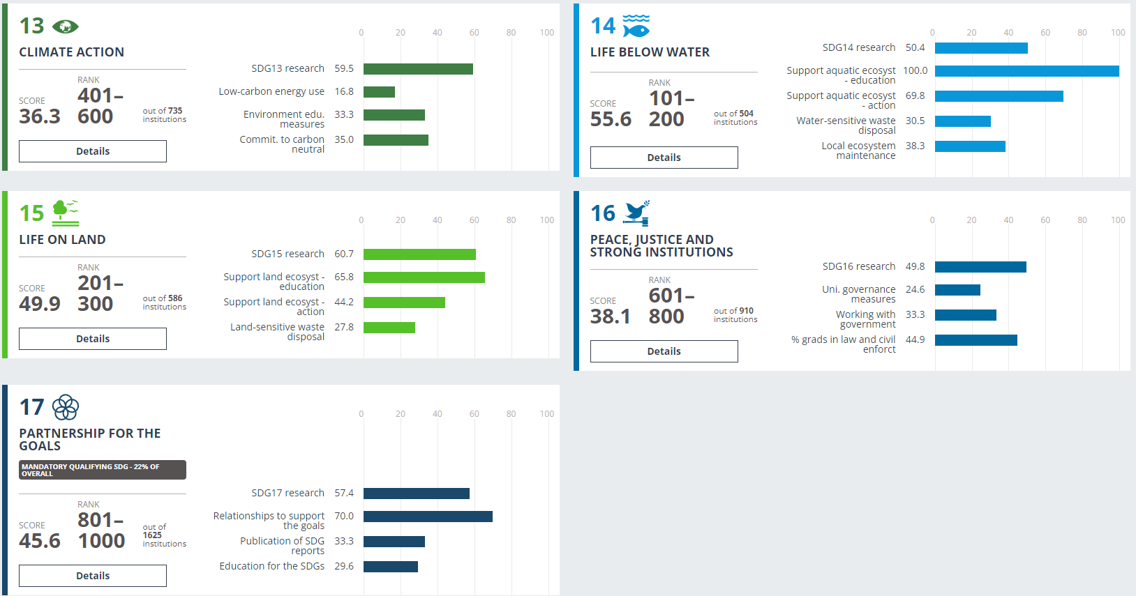 در رتبهبندی تاثیر تایمز (THE University Impact Ranking) اثرگذاری دانشگاهها بر مبنای فعالیتهای آنان در راستای اهداف توسعه پایدار سازمان ملل متحد (SDGs) و بر مبنای4 شاخص پژوهش، مدیریت، توسعه و آموزش سنجیده میشود. اهداف توسعه پایدار شامل 17 مورد: ۱- نبود فقر ۲- نبود گرسنگی ۳-سلامت و رفاه ۴- کیفیت آموزش ۵- برابری جنسیتی ۶- آب بهداشتی ۷-انرژی مقرون به صرفه و پاک ۸- اشتغال مناسب و رشد اقتصادی ۹- صنعت، نوآوری و زیرساخت ۱۰- کاهش نابرابری ۱۱- شهرها و جوامع پایدار ۱۲- تولید و مصرف مسئولانه ۱۳- عملکرد در خصوص کنترل اقلیم ۱۴- زندگی زیر آب ۱۵- زندگی در زمین ۱۶- صلح، عدالت و قدرت ۱۷- مشارکت در تحقق اهداف توسعه است.