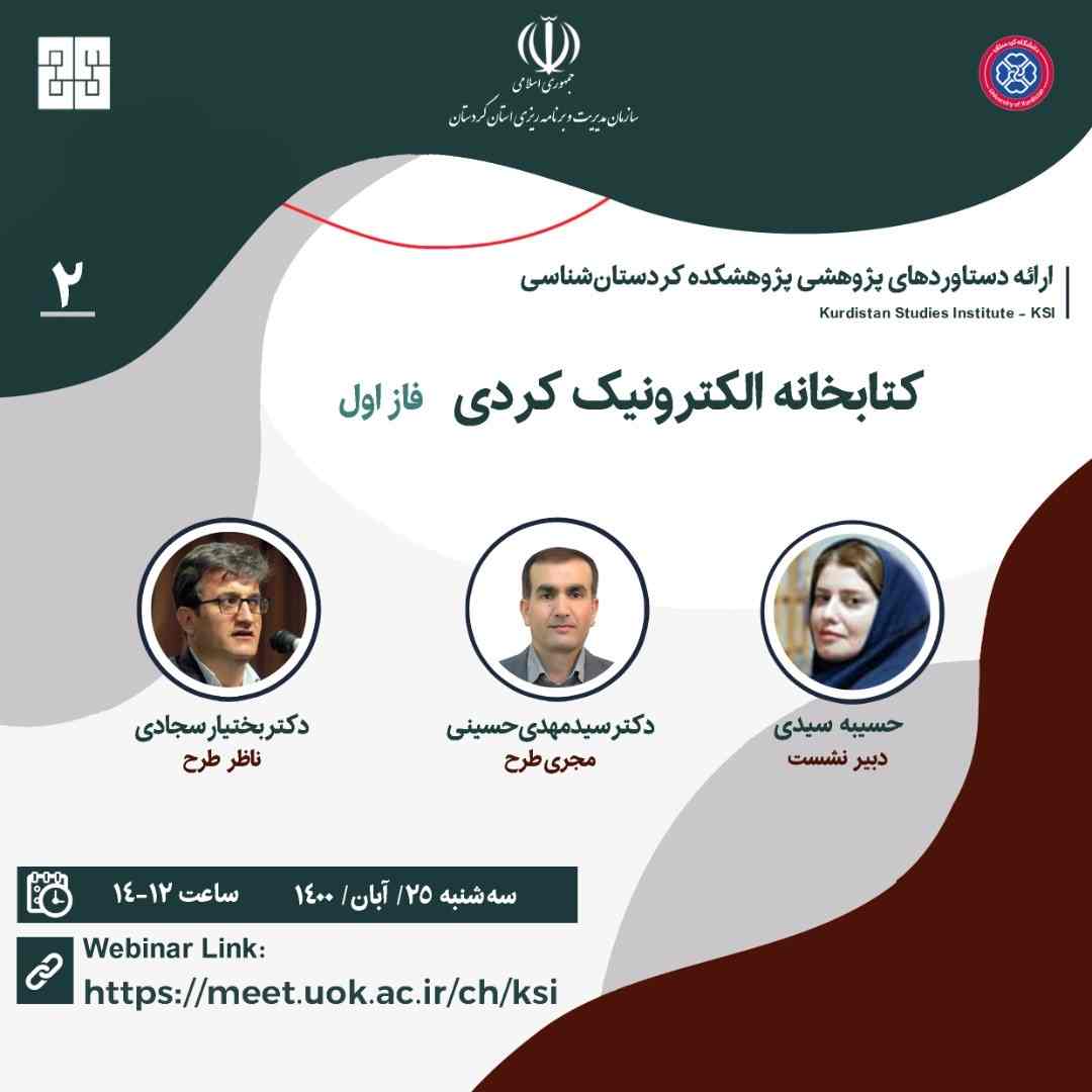 در ادامه سلسله وبینارهای ارائه دستاوردهای پژوهشی پژوهشکده کردستان شناسی دانشگاه کردستان، وبینار "کتابخانه الکترونیک کردی" برگزار میشود.
