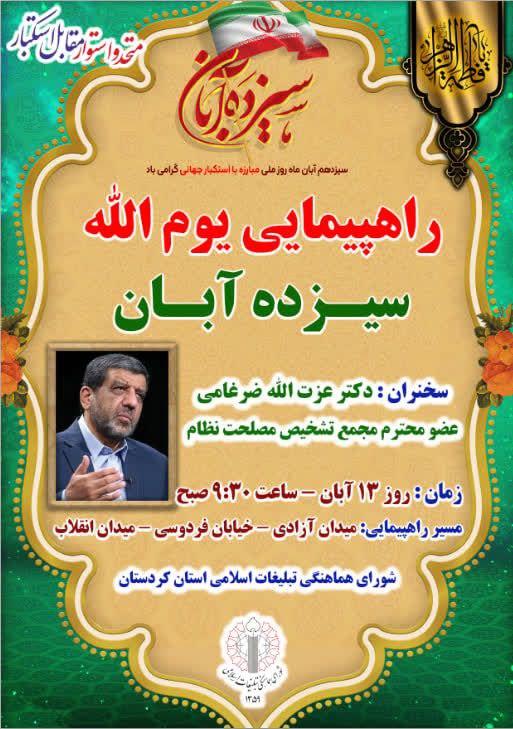 با عنايت به درپيش بودن 13 آبان روز ملي مبارزه با استكبار جهاني و سالروز تسخير لانه جاسوسي آمريكا به دست دانشجويان و دانش آموزان، بدينوسيله از محضر دانشگاهيان ارجمند دانشگاه كردستان دعوت بعمل مي آيد در مراسم راهپيمايي بزرگداشت 13 آبان حضور بهم رسانيد.