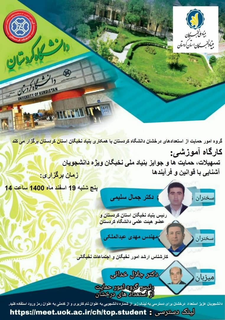 گروه امور حمایت از استعدادهای درخشان دانشگاه کردستان با همکاری بنیاد نخبگان استان کردستان برگزار می نماید.