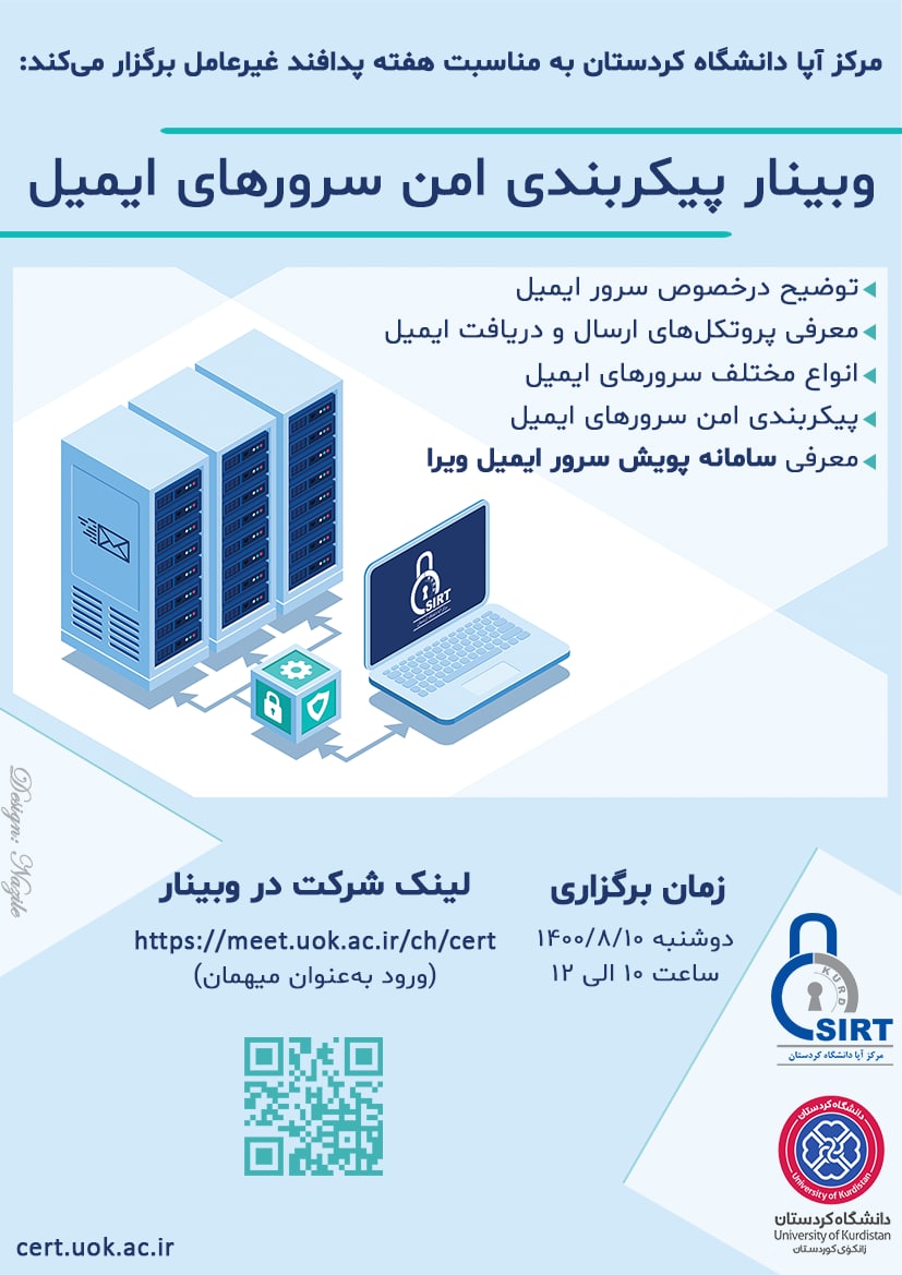 مرکز آپا دانشگاه کردستان به مناسبت هفته پدافند غیرعامل برگزار می‌کند: وبینار آموزشی با عنوان پیکربندی امن سرورهای ایمیل و مراسم رونمایی از سامانه پویش سرور ایمیل ویرا با حضور مسئولین، شرکت‌ها، مدیران و کارشناسان فناوری اطلاعات ادارات و سازمان‌های دولتی استان کردستان برگزار می‌گردد.