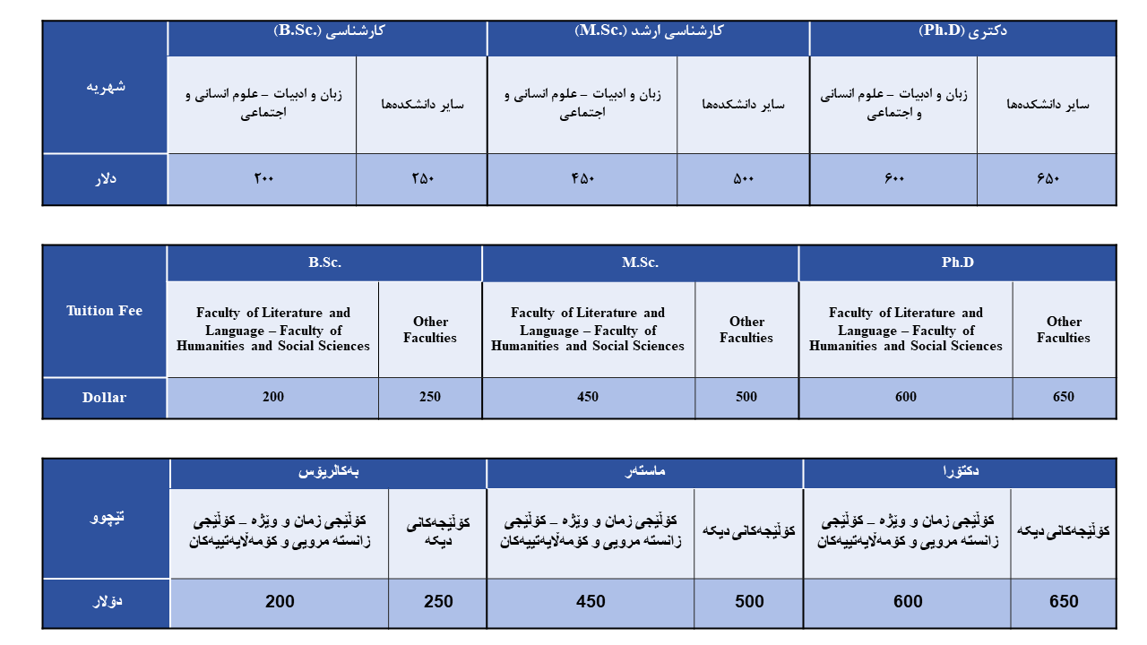 به منظور توسعه فعالیتهای بینالمللی دانشگاه کردستان و و کمک به کاهش هزینههای تحصیل دانشجویان بینالملل، آئیننامه تخفیف شهریه دانشجویان بین الملل در جلسه هیئت امنا مورخ 11 / 07 /1399 مصوب شده است. بر اساس این آییننامه به دانشجویان دارای شرایط زیر تخفیف در شهریه لحاظ میگردد: