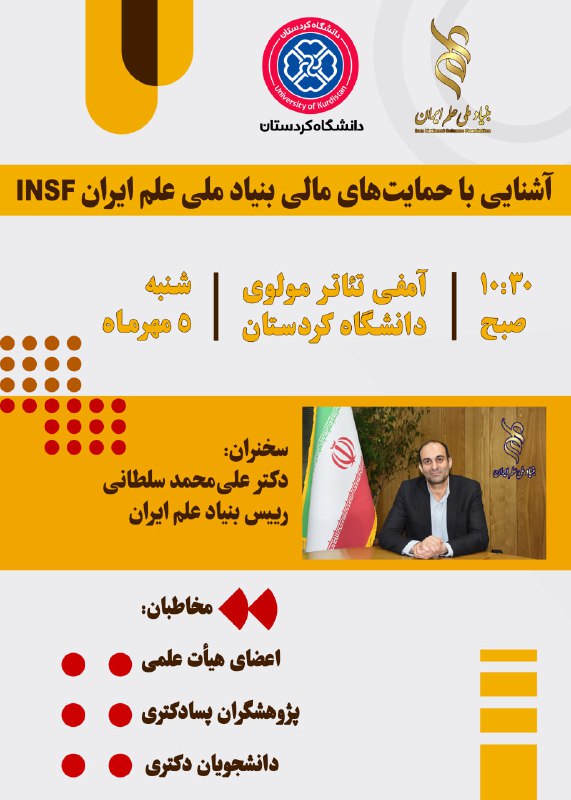 در راستای توسعه تعاملات علمی و پژوهشی، دانشگاه کردستان میزبان سخنرانی دکتر علی‌محمد سلطانی، رئیس محترم بنیاد ملی علم ایران، خواهد بود. این نشست علمی روز شنبه ۵ مهرماه ۱۴۰۴، ساعت ۱۰:۳۰ صبح در آمفی‌تئاتر مولوی دانشگاه برگزار می‌شود.