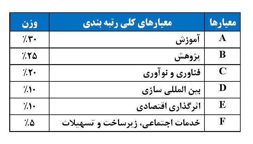 در این رتبهبندی، معیارهای کلی در ارزیابی و رتبهبندی دانشگاهها و موسسات آموزش عالی مطابق جدول زیر میباشد. (جدول 1)