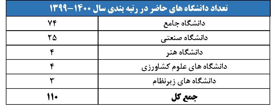 به گزارش اداره روابط عمومی مؤسسه استنادی علوم و پایش علم و فناوری (ISC)، رتبهبندی و ارزیابی 110 دانشگاه کشور توسط گروه رتبهبندی ISC انجام گرفت. نتایج این ارزیابی در جلسه 958 شورای گسترش آموزش عالی وزارت علوم، تحقیقات و فناوری در روز یکشنبه به تاریخ 1401/08/15 تأیید و مصوب شد که رتبه مطلق هر دانشگاه اعلام شود.