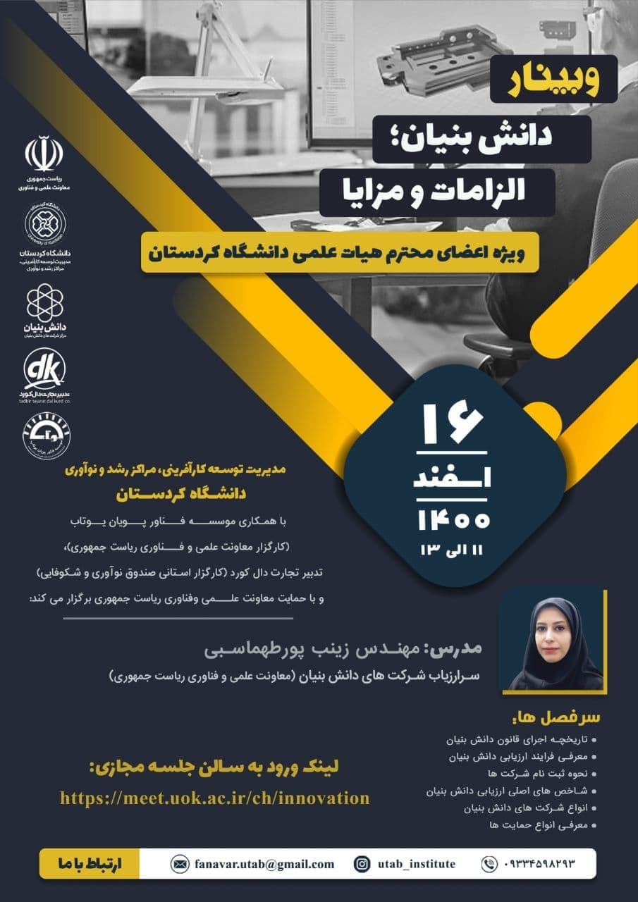 مدرس وبینار: مهندس زینب پور طهماسبی ( سرارزیاب شرکت های دانش بنیان معاونت علمی و فناوری ریاست جمهوری)