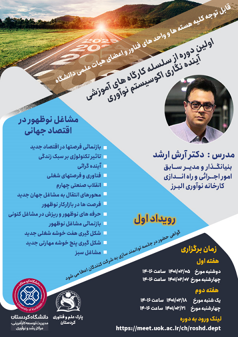 به اطلاع کلیه اساتید و هسته ها و واحد های فناور گرامی می رساند که اولین دوره از سلسله کارگاه های آموزشی آینده نگاری اکو سیستم نوآوری زیر نظر مدیریت توسعه کارآفرینی، مراکز رشد و نوآوری برگزار می گردد.