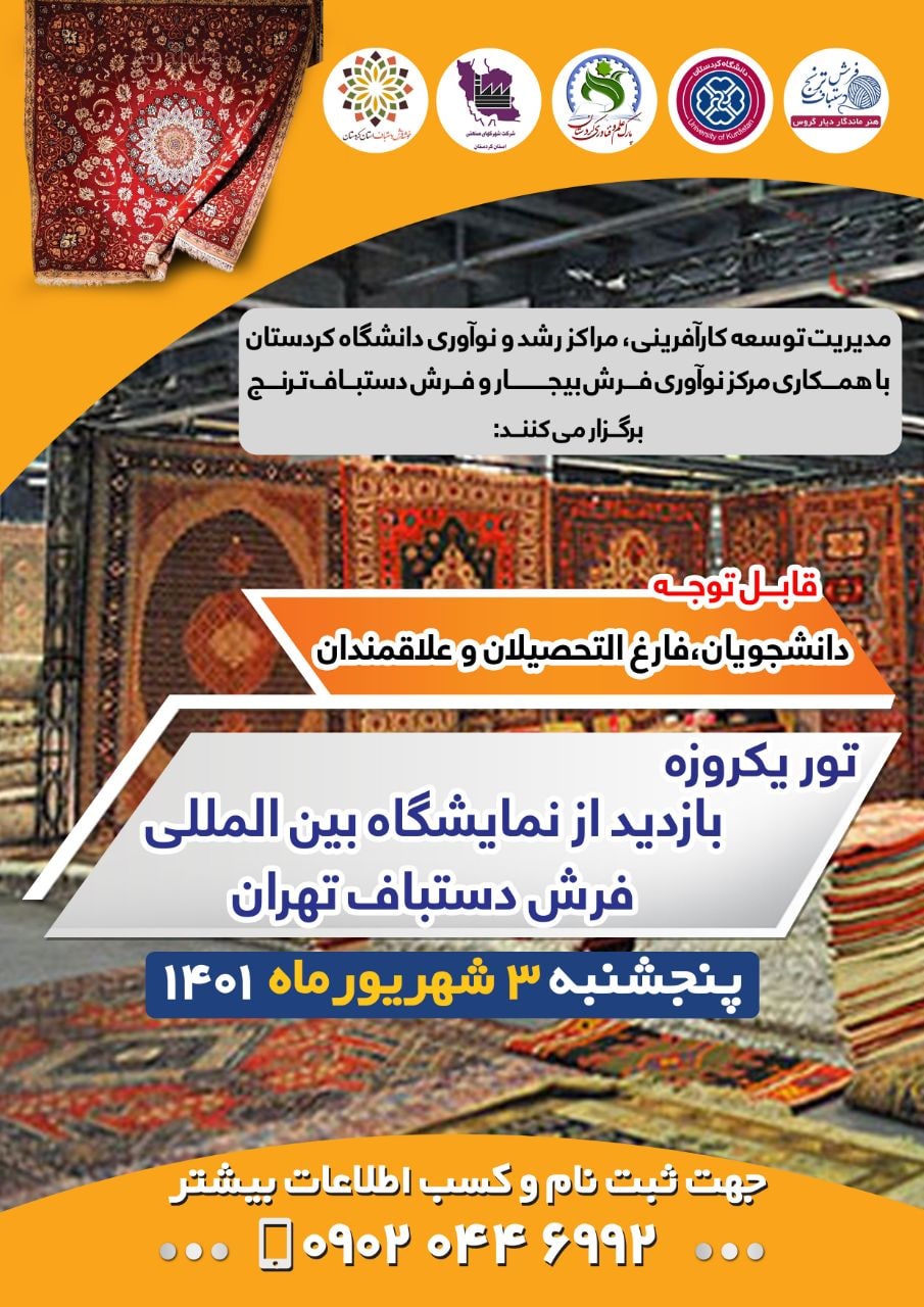 مدیریت توسعه کارآفرینی، مراکز رشد و نوآوری دانشگاه کردستان باهمکاری مرکز نوآوری فرش بیجار و فرش دستبافت ترنج و با حمایت شرکت شهرک‌های صنعتی استان و پارک علم و فناوری کردستان برگزار می کند.