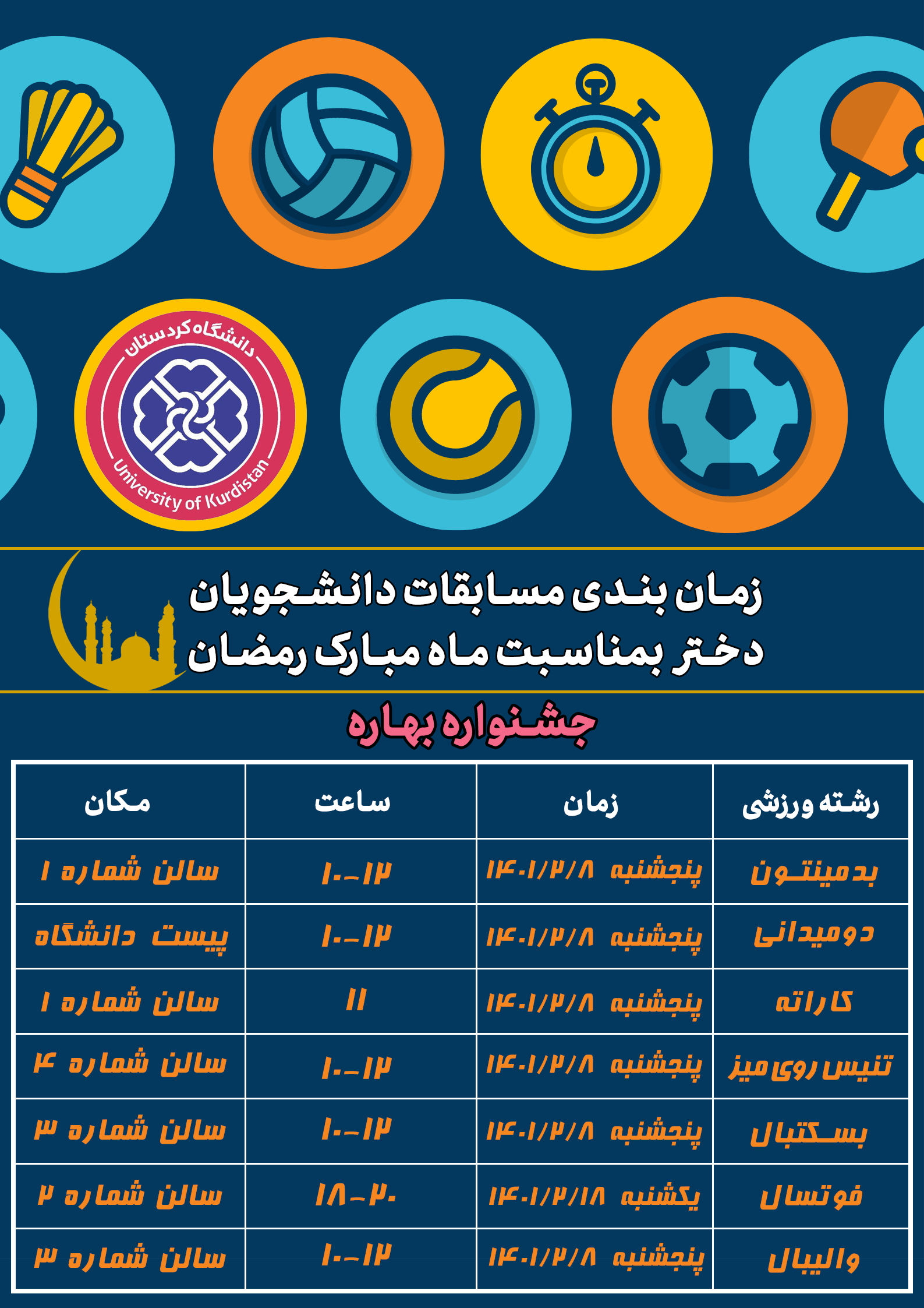زمانبندی مسابقات دانشجویان دختر بمناسبت ماه مبارک رمضان