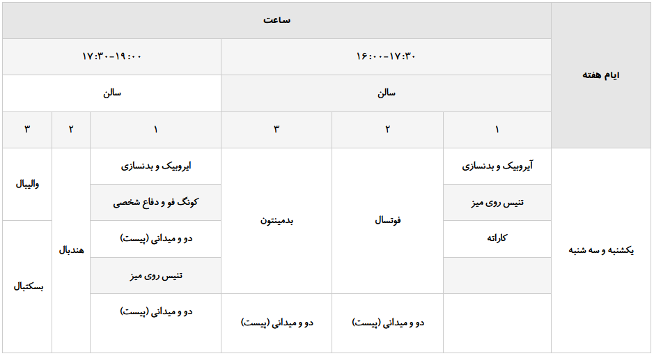 زمانبندی کلاسهای فوقبرنامه ورزشی خانمها در نیمسال اول ۹۸-۹۷ به شرح زیر است: