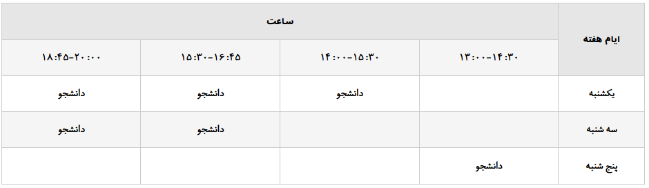 زمانبندی فوق برنامه استخر دانشجویان خانم در نیمسال دوم تحصیلی ۹۷-۹۸ به شرح زیر است: